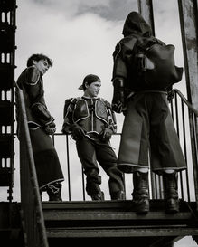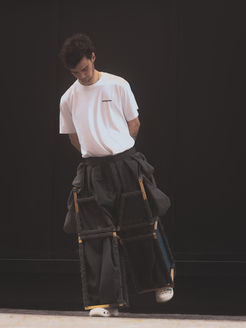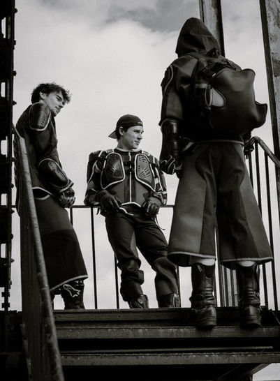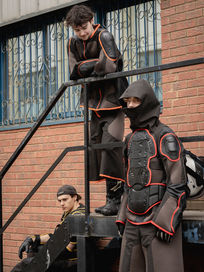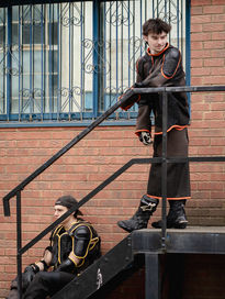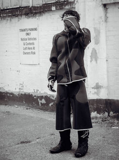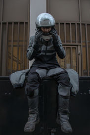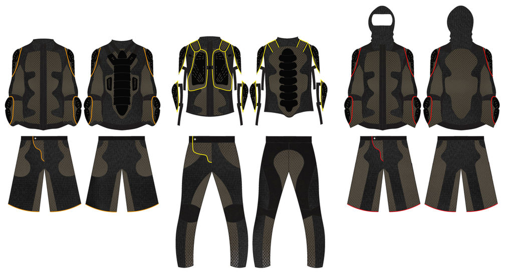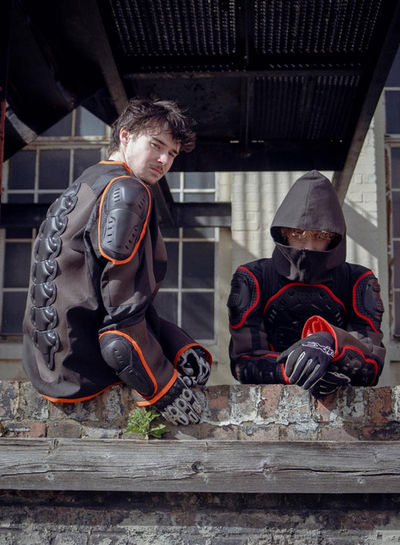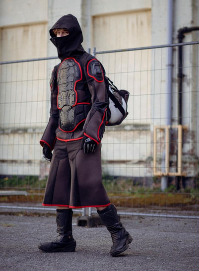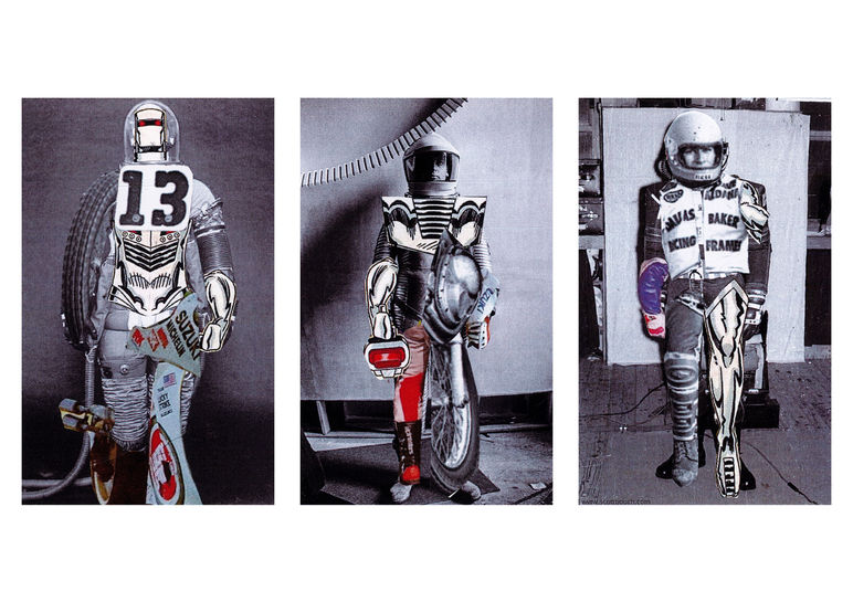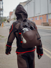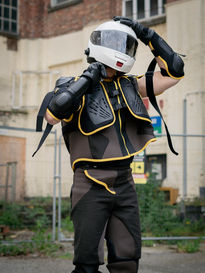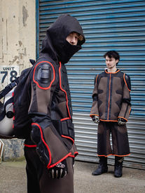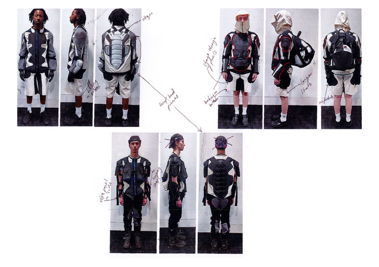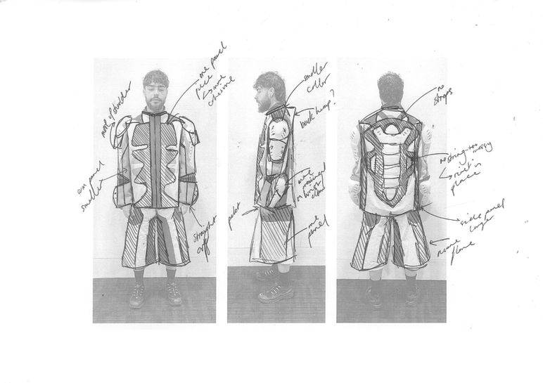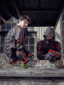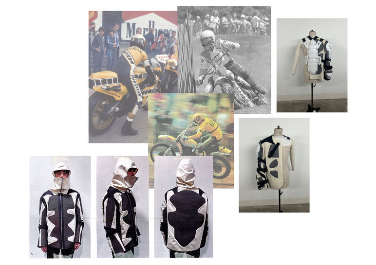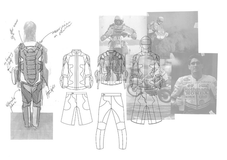 I created this collection inspired by iconic Grand prix motorcycle racers of the 1990’s and vintage motorcross racing, taking a few small details from Airforce paratroopers. My focus was to produce a collection with genuine protective qualities, so I created the collection using recycled motorcross armour, and abrasion-resistant aramid fabrics supplied to me by CQC.