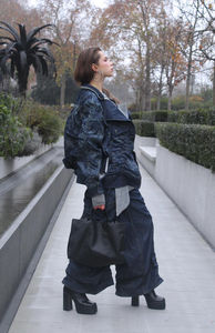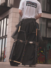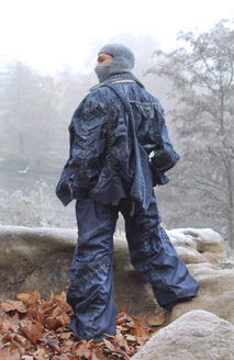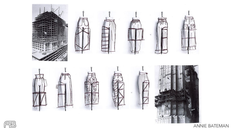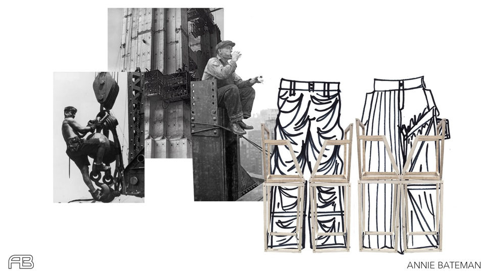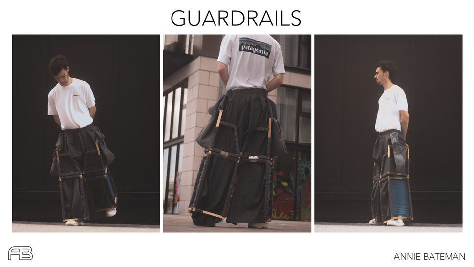 for this project i wanted to make a pair of trousers thaty were intentionally clunky and hard to walk in, inspired by the large, hard to manoeuvre construction projects of the 19th and 20th century. I made a pair of trousers with a wooden frame and hinges at the back to enable uneasy walking.